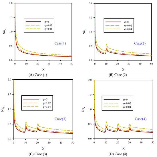 In Figure 6, the local Nusselt number on the heated wall of the microchannel is shown for Re = 10, B = 0.04, and different nanoparticles volume fractions. In this figure, we have different jet numbers with minimum fluid velocity. Nanoparticle volume fractions were 0–4%. Heat transfer occurs because of temperature differences between fluid and the top heated wall. The value of heat transfer has a direct relationship with Nusselt number and temperature line slope. Uniform temperature distribution and removal of temperature gradients are desirable and lead to higher Nusselt numbers. The local jump in the Nusselt number in Figure 6 was because of the low temperature of the injected fluid jet on the heated surface. In these areas, the heat transfer distribution was more uniform and the Nusselt number increased. In all curves for Figure 6, by adding nanoparticle volume fraction, the Nusselt number and heat transfer were significantly increased.
