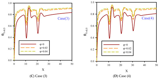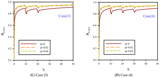 In Figure 8, local dimensionless temperature distribution on flow centerline for Re = 10, B = 0.04, and volume fractions of 0–4% is presented. The dimensionless temperature distribution in the central section of the microchannel was influenced by the reduction of fluid velocity and jet number for cases 1, 2, 3, and 4, and different nanoparticle volume fractions. Because of the temperature difference between the fluid and heated surface, the penetration of the thermal boundary layer affected all areas of the microchannel, especially the areas in the central line of flow. Figure 8 shows that increasing ϕ resulted in higher thermal conductivity of the microchannel and uniform temperature distribution in all areas of the microchannel, especially in the heated areas. Due to the higher thermal conductivity of cooling fluid in higher nanoparticle volume fractions, temperature gradients in heated areas were diminished, and also, the conductivity of the fluid layers was higher. Therefore, by increasing ϕ, heat transfer penetrated the flow centerline, and because of the higher conductivity of the fluid layers, the fluid temperature rose.