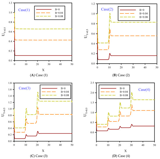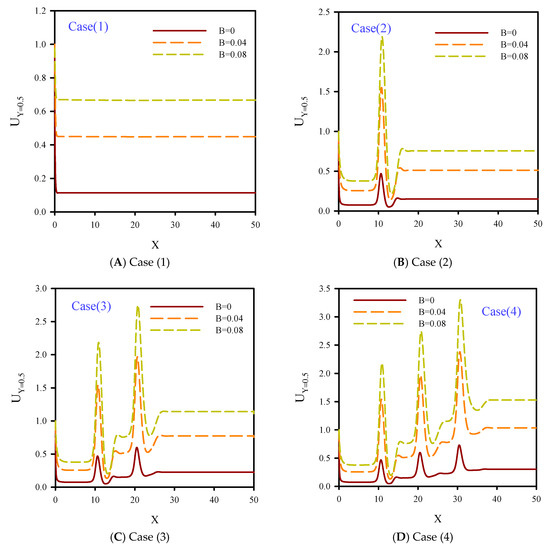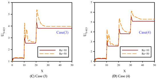 In Figure 11, dimensionless axial velocity along the flow centerline at Reynolds numbers of 10 and 50, B = 0.08, and φ = 2% are shown. Unlike Figure 10, the slip boundary condition was applied to the solid walls which facilitated fluid motion and reduced the velocity boundary layer on the solid walls of the microchannel. Therefore, the velocity profile in the flow centerline for all cases of 1, 2, 3, and 4 were lower than Figure 10. According to Figure 10 and Figure 11, increasing the slip velocity coefficient on the solid walls of the microchannel at Re = 10 had less effect than Re = 50. At Re = 50, the lateral mixture of flow covered more areas in the case with slip boundary conditions (BCs) compared with the no-slip BC case. According to Figure 11, this factor resulted in the microchannel contraction which increased the effect of jet injection areas and local axial velocity.