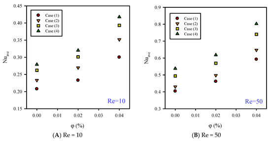 Average Nusselt number for Re = 10, 50; φ = 0, 2%, 4%; and B = 0.04.