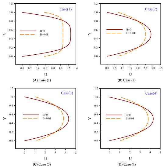 In Figure 15, dimensionless axial velocity profiles at the outlet section of the microchannel at Re = 10, φ = 4%, and slip coefficients of 0.0 and 0.08 are shown. Applying the slip coefficient on the solid walls resulted in a slight reduction of the axial velocity. By increasing the slip velocity coefficient, the velocity increased and the size of the velocity boundary layer on the heated surface decreased. According to the axial velocity profiles with the no-slip boundary condition, the effects of the velocity boundary layer was significant for the layers further away from the solid walls, and the velocity profile was stronger in the flow centerline. Therefore, from solid walls to flow centerline, the slope of the axial velocity variations was higher than the velocity profile with B = 0.08. Applying the slip velocity coefficient on the solid walls resulted in lower axial velocity gradients. The slope of the velocity curve from the walls to the flow centerline indicated lower gradients than the case with the no-slip boundary condition. The velocity profile in the central areas of the flow confirmed this issue and the corresponding curve had a milder slope.