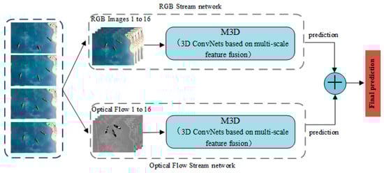 Two-Stream M3D (3D convolution Two-Stream model based on multi-scale feature fusion). M3D (3D ConvNets based on multi-scale feature fusion) extracts the features of RGB (Red-Green-Blue) sequences and optical flow sequences respectively, and gets the recognition results by averaging the output of the two networks.
