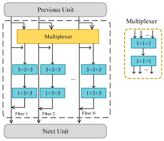 The multiplexer can share information between N paths. The first 1 × 1 × 1 convolutional layer is responsible for merging the features and reducing the number of channels, and the second 1 × 1 × 1 convolution layer distributes the feature map to each channel. The parameters within the multiplexer are randomly initialized and automatically adjusted by end-to-end backpropagation. The multi-fiber module and multiplexer are shown in Figure 2.