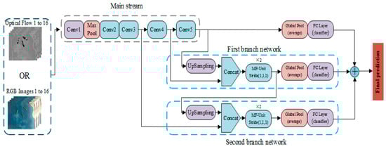 As shown in Figure 3, 3D ConvNets based on multi-scale feature fusion (M3D) consists of a mainstream network and two tributary networks. The input size of the mainstream network is 16 × 224 pixels × 224 pixels. The network settings are shown in Table 1. We carry out the spatio-temporal down-sampling in Conv5_1, Conv3_1 and Conv4_1 with stride (2, 2, 2). In Conv1 and MaxPool, the down-sampling of the spatio was carried out, and the stride is (1, 2, 2). The output of Conv5_3 is the averaged spatio-temporal pooling, and results in all kinds of recognition probabilities through the fully connected layer.