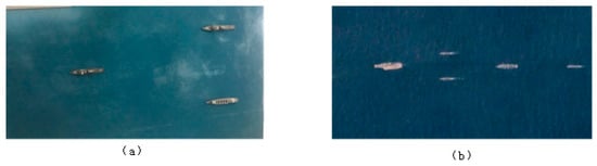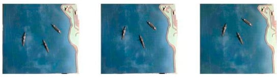 Due to the particularity of battlefield target aggregation behavior, intelligence videos are difficult to obtain. Our article does not consider the disturbances of complex environmental factors (such as complex weather, etc.). Therefore, we collected video data on a satellite simulation platform and built the dataset based on the video data. Behavioral simulation data needs to ensure a visual similarity and behavioral similarity as much as possible. In terms of visual similarity, based on the acquisition of the static images in the open network, Figure 4 shows that the simulated data set has a visual similarity with the real data. In terms of behavioral similarity, the aggregate behavior can be seen as the behavior of groups moving to a certain area. From the perspective of space, the aggregation behavior shows a relative position change in the battlefield space; from the perspective of time, the aggregation behavior is a time series of the density of the combat unit from low to high. The warships are not affected by the terrain, so the trajectory of each target in the gathering behavior is roughly a straight line. Therefore, the data of our simulation has a certain authenticity.