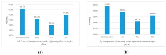 (a) Accuracy of optical flow branches under different fusion strategies. (b) Accuracy of RGB branches under different fusion strategies. We compared the accuracy rates in different fusion methods. The experimental result is the average of the results of 5-fold cross-validation tests. Concatenation works best because the concatenation method does not merge the channels and can retain the original information of the feature map.