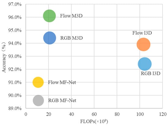 The two-stream convolutional network in this paper is divided into the RGB network and optical flow network. The network input is 16 frames of the RGB sequence or 16 frames of the optical stream sequence. In order to verify the advantages of this network framework in identifying accuracy and computational complexity, we tested the identification results of the networks in the dataset constructed in this paper. We use FLOPs (floating-point multiplication-adds) to measure the amount of computation.