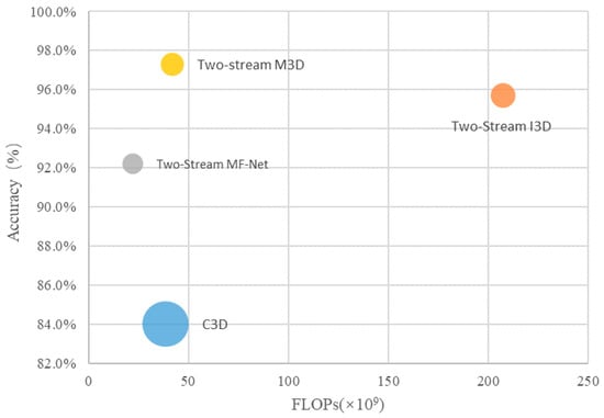 Table 6 shows the video action recognition results of different models trained on the dataset established in this paper. It can be seen that: (1) From the perspective of the network structure, the algorithm combines different size feature maps, which is not available in other networks. The fusion of a multi-scale feature map compensates for the risk of the video information loss; (2) From the experimental results, compared with the traditional single-channel input network such as C3D [14], the accuracy of the two-stream M3D is improved by 13.3%. The main reason for this is that the multi-scale feature fusion strategy can more effectively extract spatio-temporal information. Compared with the LSTM+CNN [14], the accuracy of the Two-Stream M3D is improved by 17%. The main reason is that the LSTM (Long Short-Term Memory) on features from the last layers of ConvNets can model a high-level variation, but may not be able to capture fine low-level motion. Because CNN loses many fine-grained underlying features during down-sampling, these underlying features may be critical for a proper motion recognition. That is to say, the feature map outputted by CNN loses the information of smaller targets. If this feature map is input into LSTM for a timing analysis, the recognition result will be greatly affected. Compared with the two-stream network, the Two-Stream M3D proposed in this paper effectively improves the recognition accuracy, which is 1.6% and 5.1% higher than Two-Stream I3D and Two-Stream MF-Net, respectively. Figure 9 shows that the proposed model achieves a good trade-off between computational complexity and accuracy.