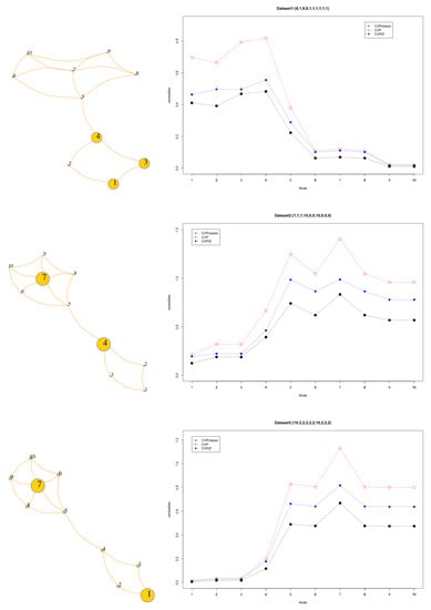 In the lower graph of Figure 4, corresponding to dataset , the importance of connectivity is also seen. Although nodes 1 and 7 have the maximum data, node 7 is the most relevant due to its connectivity (grade 5), compared to node 1 that only has degree 2. The nodes connected to node 7 present a higher centrality for its greater connectivity. The fact repeated is that the greatest differences in the values of the centralities occur when data are present in the nodes.