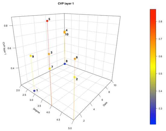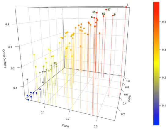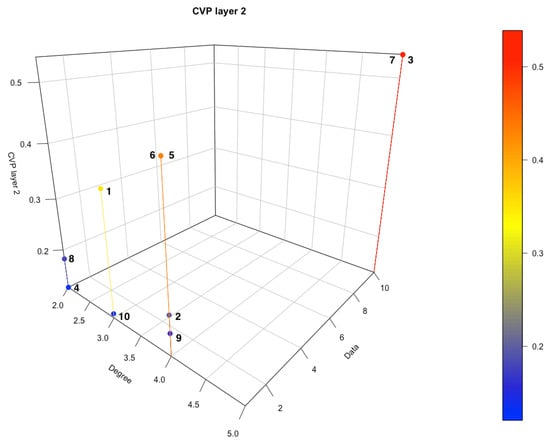 The way in which we calculate the centralities CVP (eigenvector centrality with data) and CVP2f (eigenvector centrality based on the two-layer PageRank approach) differs from the way in which the classical eigenvector centrality is calculated. When considering the CVP centrality it is assumed that the importance of the data associated with the node itself may be not negligible in the calculation of its importance within the network. If the expression (3) is observed, we notice the presence of the component , which fulfills this function precisely and which does not appear in the classical eigenvector centrality.