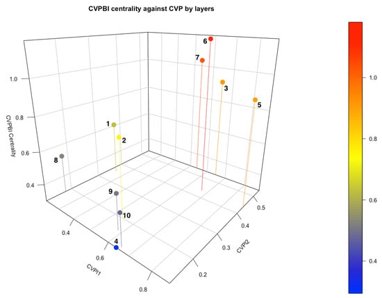 The biplex centrality for the jazz artists network is displayed in Figure 10, where the biplex centrality CVPBI is represented in front of the individual centralities of each layer. Figure 10 shows how there is a group of nodes with very high CVPBI centrality and a low centrality in layer 2.