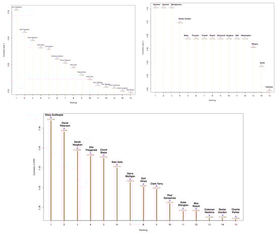 Considering the network as a whole and not individually by layers, the influences of the different relationships between the nodes and the data associated with them are mixed together and the layers interact. Applying Algorithm 2 a ranking is obtained (see Figure 11 down).The winner is Dizzy Gillespie, a trumpet virtuoso and improviser. In the 1940s Gillespie, with Charlie Parker, became a major figure in the development of bebop and modern jazz. The second artist in the classification is Oscar Peterson, exceptional pianist in the history of music. Being born in 1925, being contemporary of many jazz greats with whom he has collaborated actively throughout his career and his extensive musical production of both albums and singles takes to occupy a high position in this ranking. In the third place appears Sarah Vaughan, born in 1924. As in the previous case, her enormous musical production and having sung with the most relevant artists in the history of jazz cause her to be in second place. The same behavior repeats with the rest of the artists.