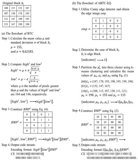 Figure 1a,b show the encoding flowcharts of BTC [] and ABTC-EQ [], respectively. To simplify our example shown in Figure 1, a single block sized pixels using BTC and ABTC-EQ, respectively, is demonstrated. We used Equation (9) to calculate the Mean Square Error (MSE) of BTC and ABTC-EQ, whose values were 698 and 55, respectively. Obviously, ABTC-EQ has good performance when a block is in the complexity area.