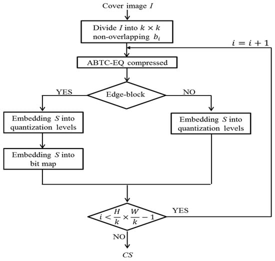 In our data embedding phase, the input cover image is sized as . Each block is sized pixels, where . Note that the ABTC-EQ procedure is also included as shown in Figure 4. Secret information S is a bitstream in binary form, and is the value of a secret bit in S, where and . N is the number of maximum capacity of cover image I. And S is embedded into the ABTC-EQ compressed code stream of cover image I.