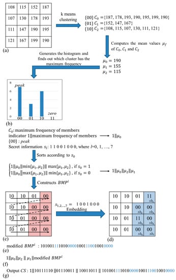 We obtain the modified code stream CS, which concealed the S after all the steps are completed. An example of our proposed data embedding phase is shown in Figure 5 to explain each step in detail. Figure 5a shows an example of a sized block . Figure 5b presents the histogram of three clusters corresponding in block . Figure 5c,d present the original and the modified , respectively. Figure 5e provides the code stream of a modified . Figure 5f is the sequence of the indicator, three quantization levels and modified . Figure 5f presents the binary form of Figure 5g. In Figure 5, all pixels in block will be partitioned into three clusters exploiting k-means clustering. Then, compute the mean values of three clusters using Equation (3). Because has the largest population, the corresponding to is peak. The indicator and three quantization levels ’s will be encoded by while the next is 1. In the next step, construct , embed the next into using Equation (10) and obtain the modified . Finally, we obtain the modified code stream CS.