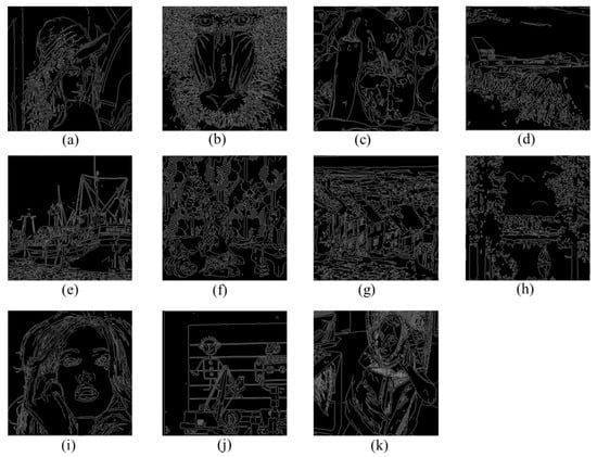 Canny edge detection images of test images: (a) Lena, (b) Baboon, (c) Peppers, (d) F-16, (e) Fishing Boat, (f) Girl, (g) Gold hill, (h) Sailboat, (i) Tiffany, (j) Toys, and (k) Barbara.