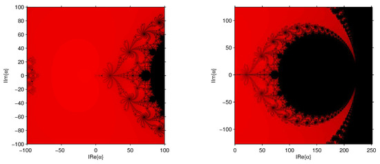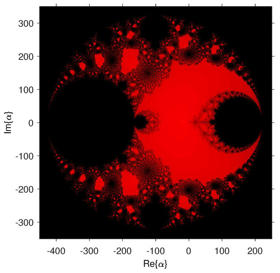 Since , we have at most one free independent critical point, consequently, there exist only one parameter plane of the family. If we consider the independent free critical point as a starting point of the iterative schemes of the family associated with each complex value of , this point of the complex plane is painted in red if the method converges to any of the roots (zero and infinity) and they are black in other cases. The lower the number of iterations, the brighter the color used. Following this procedure, we obtain the parameter plane presented in Figure 2, by using the processes described in [14]. We have used a mesh of points, 500 maximum iterations and as the tolerance used in the stopping criterium. We also show a zoom of this parameter plane in Figure 3a, focusing on the biggest red area, where the members of family (1) are, in general, very stable. These would be the best values, a priori, to apply the iterative methods in terms of stability.