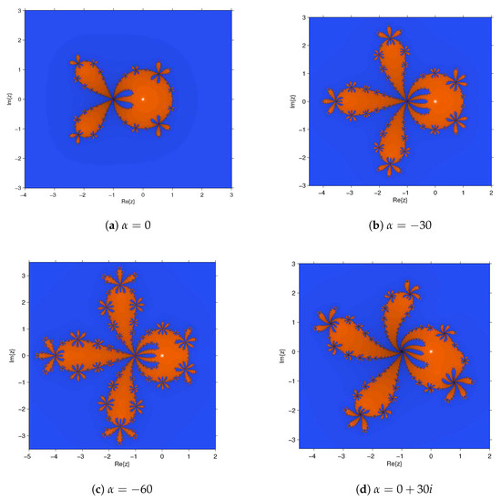 We depict the parameter space associated with a free critical point of operator (6) by associating each point of the parameter plane with a complex value of , i.e., with an element of family (1). Every value of belonging to the same connected component of the parameter space gives rise to subsets of schemes of family (1) with similar dynamical behavior. Therefore, our objective is to find regions of the parameter plane as much stable as possible, due to the fact that the values of in these regions will provide the best members of the family in terms of numerical stability.