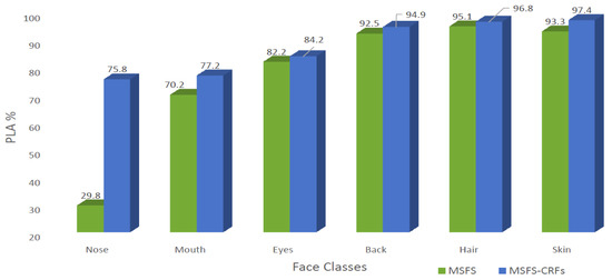 We compared the performance of our proposed segmentation model (MSFS-CRFs) with previously proposed MSFS [12] in Figure 4. From Figure 4, it is clear that we improved PLA values for all the six classes. The most beneficial classes are smaller classes, particularly the nose. The PLA of the nose increased from 29.8% to 75.8%, which is improvement by a large margin.