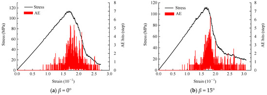 Figure 12 shows the stress–strain–AE relationship of double-fractured rock samples under different rock-bridge angles β. The influence of the rock-bridge angle on the AE characteristics of rock samples is mainly reflected in the AE signal strength and the corresponding strain values. When the rock-bridge angle is in the range from 0° to 90°, the ringing count strength of AE has decreases first and then increases. When β equals 75°, the minimum strength is observed. The peak of two or three AE ringing bursts appears when β equals 75° or 90°. The stress is reduced to a certain extent after the peak, exhibiting a rebound phenomenon, and the strain value corresponding to the initial peak value is smaller, mainly due to the different failure modes of the rock samples (as per Figure 8). A wing crack appears in the tip of the crack, and rock-bridge fracture occurs through prefabricated fissure coalescence, which makes the basic failure of the rock mass reach the peak stress. However, the rock sample is not completely coalesced and exhibits a residual stress. By continuing loading, a new peak stress occurs when the rock sample is completely coalesced, and then the stress drops.