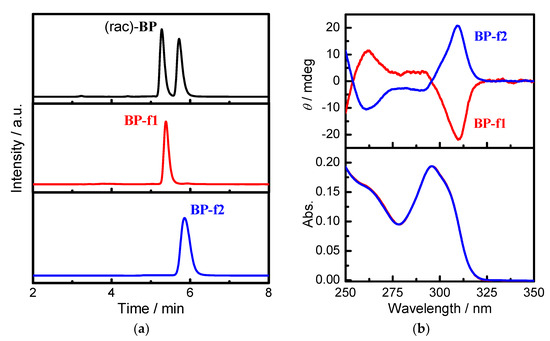 The chiral resolution of BP was carried out by preparative chiral-phase HPLC equipped with a chiral column (Chiralpak IA). The enantiomers of BP were successfully resolved into two fractions, BP-f1 and BP-f2, with the retention time of 5.3 min and 5.7 min, respectively, eluted with a mixture of hexane and dichloromethane at 20 °C (Figure 1a). On the basis of the enantiomer peak integrations, each separated enantiomer was determined to have a purity of >99%.