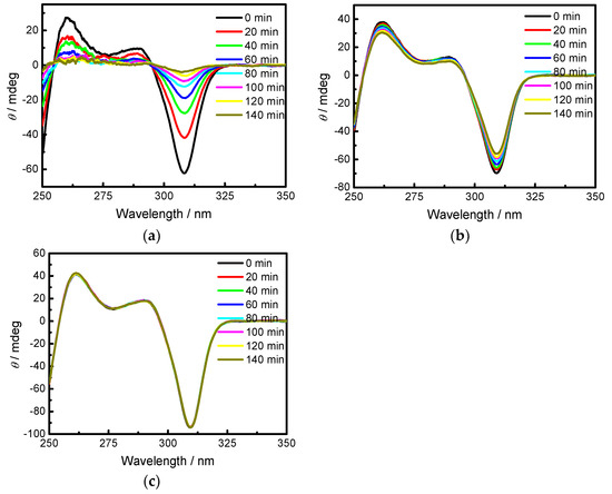 The observed time-dependent CD changes satisfied the first-order kinetics (Scheme 1), in which krac (s−1) is the rate constant for the racemization. The linear regression analysis of the CD data gave the rate constants (krac). The half-life time (t1/2) was obtained from Equation (A1), as follows: