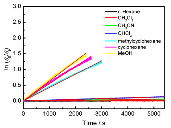 Plot of ln(θ0/θt) against time of BP-f1 in in various solvents at 25 °C.