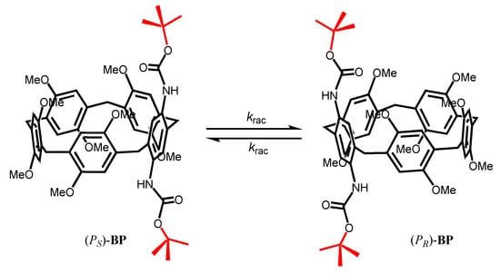 Chiral macrocyclic molecules have attracted significant attention, because they are highly promising in applications for chiral induction [1,2,3], molecular recognition [4,5,6], and asymmetric catalysis [7,8,9]. A great number of macrocyclic compounds have been developed for the purpose of studying their optical properties [10,11,12]. Recently, the chirality of a novel emerging host molecule, pillar[n]arenes, has attracted increasing attention [13,14,15,16]. Pillar[n]arenes are macrocyclic compounds that are composed of several hydroquinone ether units and are featured by the well-defined cavity, unique host–guest complexation properties, and readily chemical functionalization. Normal pillar[5]arenes have two enantiomeric conformers with all hydroquinone ether units adapting a planar chiral Rp, (Rp, Rp, Rp, Rp, and Rp) or Sp, (Sp, Sp, Sp, Sp, and Sp) configuration. In general, these two conformers are rapidly interconvertible in a solution by flipping the ring units around the methylene bridges, the so-called oxygen-through-annulus rotation [17]. The inhibition of the oxygen-through-annulus rotation will lead to a pair of planar-chiral enantiomers. Three approaches, including rotaxanation, the introduction of a side ring into one ring unit, as well as the chemical modification of bulky groups onto the rims, have been exploited for constructing chiral pillar[5]arenes [18,19,20]. Bulky groups, such as cyclohexylmethyl, phenyl, or bithienyl groups, have been chemically grafted onto one or more hydroquinone ether units, and the oxygen-through-annulus rotation was restrained or completely stopped [21,22]. It occurred to us that if introducing a group of suitable size, the oxygen-through-annulus could still be allowed, but the rotation velocity is slowed down. This will then provide a powerful tool to study the effect of the external factors, such as the temperature and solvent, on the rotational kinetics of pillar[5]arene. Herein, we report on the successful isolation of butoxycarbonyl (Boc)-protected pillar[4]arene-[1]diaminobenzene (BP) planar chiral enantiomers. Two middle-sized Boc-protected substituents on the A1/A2 positions significantly decelerated the flip of pillar[5]arene, to allow for the racemization of BP with an observable velocity. The thermodynamics and kinetics of the racemization were investigated under different solvent and temperature conditions, which may serve as a guideline in the isolation and control of the enantiomeric conformations of pillar[n]arenes by manipulating the external factors.