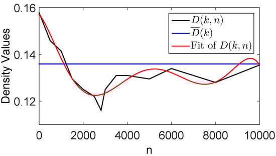 Figure 1 shows the trend of the local density in the case of . Starting approximately from this value of , we can notice a minimum value for the distribution of , which is located immediately after the transient state, that is, at the lower bound of the interval . Such a minimum value is about a 10 percent lower than the average density . In fact, as previously explained, the multipliers of the prime are just primes up to , whereupon they can be even composites. It follows that the distribution of the composite multipliers compensate the decreasing distribution of the multipliers that are prime numbers only starting from the multiple . Therefore, as , such a compensation is delaying, in such a way the ratio between and more and more grows up to the value of Equation (35). As a matter of fact, if all the multipliers were primes, their distribution would decrease by following a logarithmic trend, so that would augment with the same trend, by starting from the minimum value in the interval . In the real case, however, the compensation given by the composite multipliers has the effect that the local density does not grow indefinitely, but tends to the limit value . Let us notice that, if we stop the procedure to a finite value of , the ratio between and is , where the succession is increasing and tends to the limit value as .