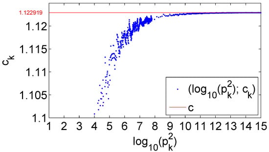 Figure 2 shows the trend of the succession , as approaches infinity. Evidently, such a succession tends to the constant value . The x-axis is in a logarithmic scale, in such a way the values of can be visualized up to .