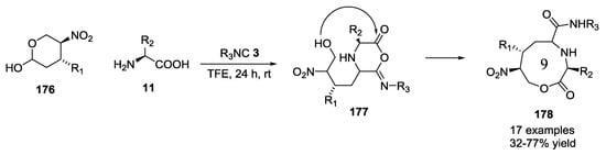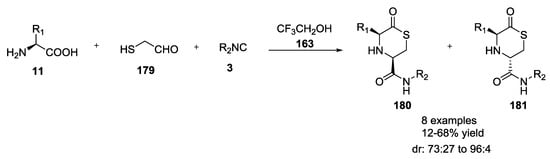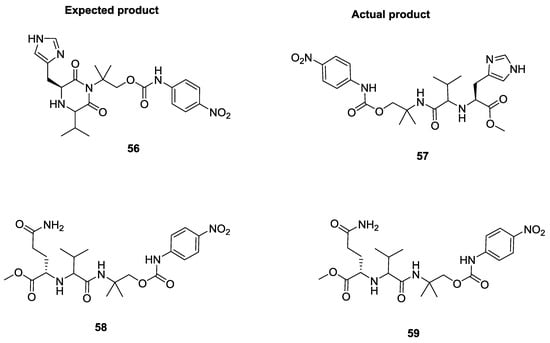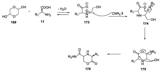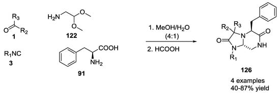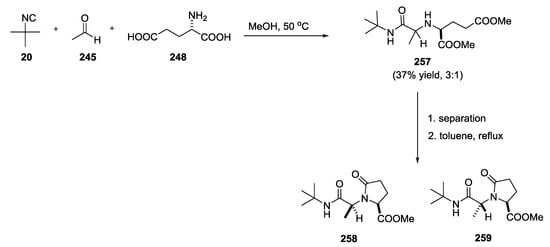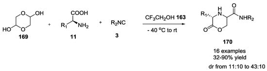 Sello et al. reported the U-5C-4CR with isocyanocarbamates, α-amino acids and aldehydes []. It is worth noting that, when histidine was used as starting α-amino acid, the product was linear rather than cyclic as reported by Ugi (Figure 2). On the other hand, with glutamine, although a linear product was expected, the observation of a piperazinedione structure was indicative of a ring-closure due to intramolecular attack of the glutamine primary amide into the Ugi imino anhydride intermediate.