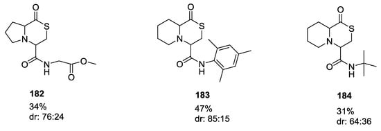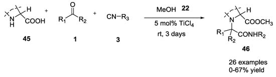 To expand the molecular diversity of Ugi 5C-4CR, various symmetrical and asymmetrical ketones were combined with secondary α-amino acids []. Also in this case, catalytic amounts of TiCl4 as Lewis acid proved to increase the reaction yield. The combination of bulky ketones with unbulky isocyanides gave the best yields, while unbulky ketones gave no significative difference in yields if combined with bulky or unbulky isocyanides (0–67% yield, Scheme 9). The diastereoselectivity of the U-5C-4CR may be sensitive to the nature of coupling reagents and reaction conditions. Following 2D-NMR studies on strained cyclic analogues, the authors noticed that the degree and the sense of diastereoinduction observed could not be easily rationalized.
