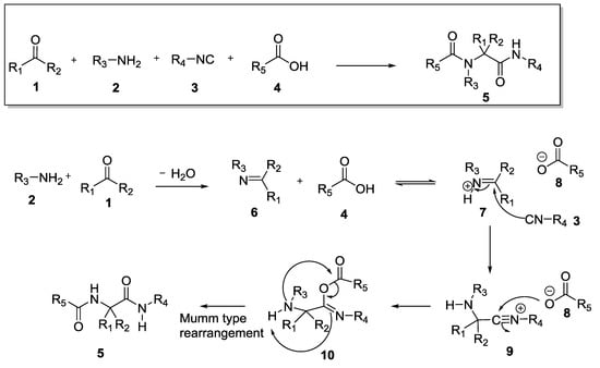 Multicomponent reactions (MCRs) represent an efficient one-pot synthetic strategy to generate, from three or more reagents, a new product containing almost all portions of the starting materials. For their convergent nature, atom economy and efficiency, MCRs are considered valuable methodologies for both medicinal and organic chemists. In particular, Isocyanide-based Multicomponent Reactions (IMCRs) [,,,], have been proven to be an ideal tool to provide in one single step medium-complexity molecular skeletons, usually accessible only via a multistep approach. Most of MCR chemistry is performed with isocyanides and is related to the Ugi reaction [,], a four-component transformation (4CR) described in 1959 by Professor Ivar Ugi. In the reaction, an acid component, like a carboxylic acid, reacts with an oxo-component (a ketone or an aldehyde), a primary amine, and an isocyanide. In detail, as shown in Scheme 1, the first step is the condensation between the oxo-component 1 and the amine 2 to generate the Schiff base 6. Then, the acid component protonates the nitrogen atom of the Schiff base thus increasing its electrophilicity. Hence, the nucleophilic addition of the isocyanide 3 to the Schiff base produces the nitrilium ion 9, which rapidly reacts with the nucleophilic carboxylic acid anion 8. The α-adduct 10 so formed is finally converted into the Ugi product 5 through an intramolecular acylation, which resembles the Mumm-type rearrangement.