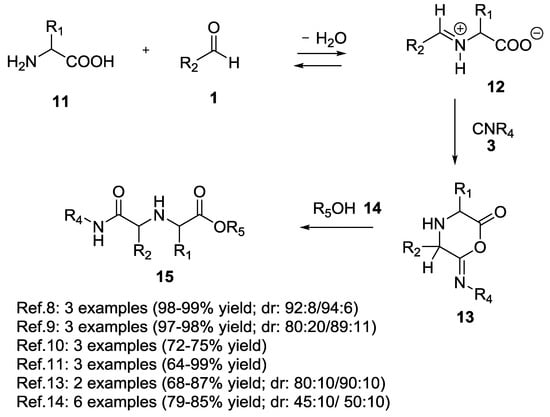 In 1996, Ugi et al. described the first Ugi 5C-4CR using an α-amino acid as a starting bi-functional material to yield 1,1′-iminodicarboxylic acid derivatives (97–99% yield, Scheme 2) [,,,,,,]. In the proposed reaction mechanism (Scheme 2) the amine functional group of the α-amino acid condenses with the aldehyde 1 to give the imine 12. The subsequent α-addition of the isocyanide followed by the intramolecular interception of the nitrilium ion, forms an O-acylamide 13. The nucleophilic attack of the fourth component (the alcohol, i.e., the fifth reacting center) 14 at the carboxylic carbon atom and the subsequent rearrangement provides the 1,1′-iminodicarboxylic acid ester derivative 15. Notably, the side chain of tri-functional α-amino acids (L-Serine, L-Threonine, L-Tyrosine, L-Asparagine, L-Glutamine, L-Methionine) did not participate in the Ugi reaction.