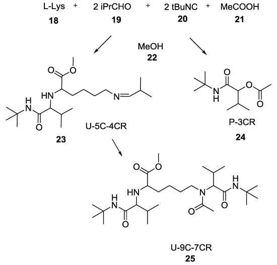 The use of lysine triggered some interesting studies regarding the possibility of combining more than one MCR in tandem. Indeed, this α-amino acid can react with two equivalents of aldehyde, an isocyanide, and a carboxylic acid to afford the linear product 23 in 22.8% yield (Scheme 3) along with the Passerini product 24 in 18.5% yield []. Excess of isocyanide, and carboxylic acid led to the Ugi Nine Center Seven Component Reaction (U-9C-7CR) product 25 in 8% yield.
