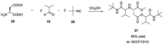 Similarly, a tandem Ugi-Passerini reaction was observed when L- glutamic and L-aspartic acid were used (Scheme 4) []. In particular, the Ugi reaction using L-aspartic acid (26) with two equivalents of both aldehyde and isocyanide provided a linear compound 27 in contrast to from L-glutamic acid that gave cyclic diketopiperazine.
