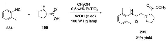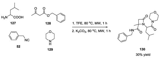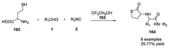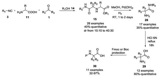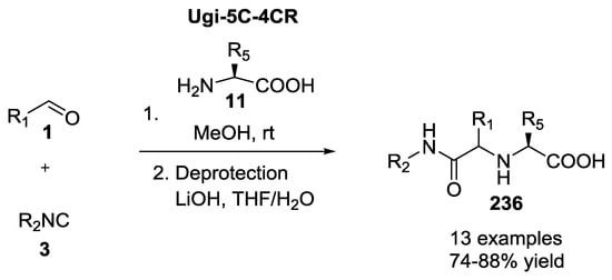 The replacement of one of the components of the Ugi reaction, or the incorporation of two or more functional groups into a single moiety, as well as the combination of the Ugi reaction with other chemical transformations have provided straightforward synthetic approaches to a large number of different scaffolds with a rich structural diversity. In particular, the presence of a primary amine and a carboxylic acid functional group both in natural and unnatural α-amino acids make them very useful synthons suitable for a three-component Ugi-like reaction (3CUR) [].