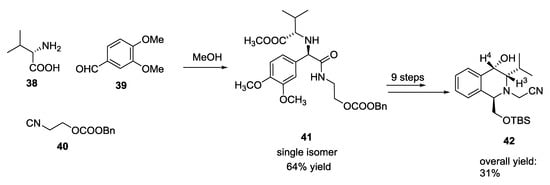 Further information about the possibility of a substantial diastereoselectivity in the U-5C-4CR came from a report by Chen X. et al. The Ugi reaction of α-amino acids such as L-valine and L-serine, aromatic aldehydes, and isocyanides was employed for the synthesis of 1,1′-iminodicarboxylic acid derivatives, which were then used as key intermediates to synthesize tetrahydroisoquinoline compounds (Scheme 7) []. L-valine gave tetrahydroisoquinolin-4-ol 42 in nine reaction steps with high stereoselectivity. The configuration of the cyclic compound 42 was hence determined by NOESY NMR. Substituent at C-3 and C-4 resulted in a cis configuration as showed by correlation between H-3 (δ = 2.73 ppm) and H-4 (δ = 4.57 ppm). Consequently, the absolute configuration of C-1 and C-4 in 42 was determined to be R and S, respectively. Subsequently, Ugi product 41 from (S)-valine had the S,R configuration. This result could support a general rule regarding the stereochemistry of the similar Ugi reactions harnessing primary α-amino acids.