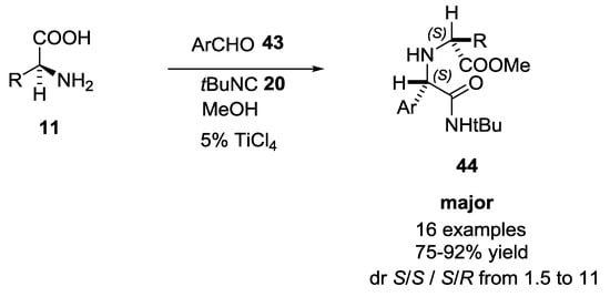 Ciufolini and coworkers screened two Brønsted acids and thirteen Lewis acids to extend the scope of Ugi reaction involving α-amino acids and aromatic aldehydes (Scheme 8) []. Brønsted acids proved to be ineffective and harmful promoters. For example, trifluoracetic acid showed no improvement of the reaction and methanesulfonic acid gave no desired compound, perhaps due to polymerization or degradation of the isocyanide. In contrast, Lewis acids had beneficial effects on both yields and rates. TiCl4 showed the best results (75–90% yield), which were not attributable to the HCl in situ release. The sense of diastereoinduction is (S,S), as confirmed by X-ray crystallography.