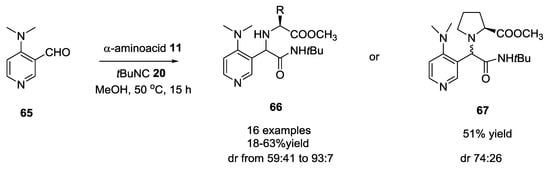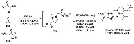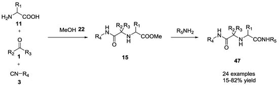Dömling and co-workers investigated the one-pot conversion of the methyl ester function of the U-5C-4CR scaffold []. They described a one-pot amidation (24 examples, 15–82% yield, Scheme 10) from α-amino acid methyl esters under solventless conditions and at ambient temperature or using THF as solvent and several different amines, including aliphatic, heterocyclic, aromatic, and functionalized ones.