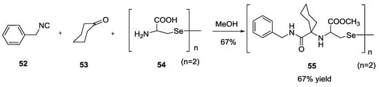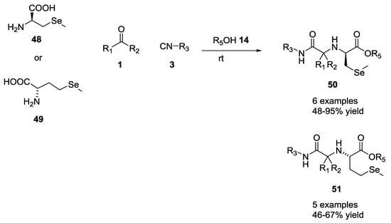 The same group reported a variation of the Ugi reaction using bifunctional selenium α-amino acids as starting materials to generate derivatives including methyl selenocysteine 48 and selenomethionine 49 (11 examples, 48–95% yield, Scheme 11) [].