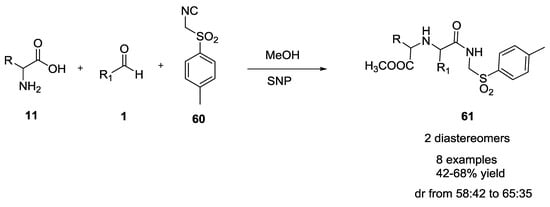 Recently, Esrafili and coworkers described an efficient and green one-pot synthesis of sulfonylamide derivatives (42–68% yield, Scheme 13) from L-α-amino acids, aromatic aldehydes and p-toluenesulfonylmethyl isocyanide in water/methanol using silica nanoparticles (SNP) as the catalyst []. In the absence of SNP, the reactions did not work efficiently, and products 61 were obtained in low yields.