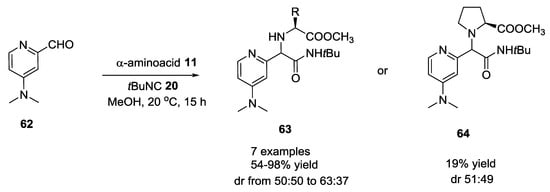Dimethylaminopyridine (DMAP)-based aldehydes were used with α-amino acids and tert-butyl isocyanide in the Ugi reaction to produce diverse chiral DMAP derivatives []. 4-(dimethylamino)-2-pyridine-carboxaldehyde 62 (Scheme 14) afforded products with low diasteroselectivity compared to 4-(dimethylamino)-3-pyridine carboxaldehyde 65 (Scheme 15). Diastereomeric ratios and yields were obtained changing substrates concentration and α-amino acids used in the Ugi reaction.