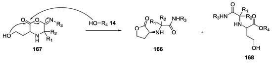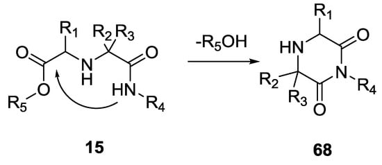 One of the first reports regarding the obtaining of a diketopiperazine scaffold was by Ugi et al. in 1998. The formation of 2,6-piperazinediones was accomplished under weak basic conditions and in a one-pot reaction by using only ketones (43–70%, Scheme 16) []. Alternatively, the U-5C-4CR products 15 could be cyclized to 2,6-piperazindiones 68 by refluxing them in THF under basic conditions using potassium tert-butoxide (68–72% yield). However, stronger basic conditions and higher temperatures resulted in the racemization of the chiral centers.