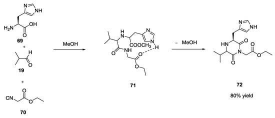 One exception had been reported, again by Ugi, a couple of years previously, when histidine 69 was used as starting α-amino acid with an aldehyde and an isocyanoester. In this case, the formation of intramolecular H-bonds between the -NH of imidazole ring and the carbonyl group of isocyanoester 71 allowed for the isolation of the diketopiperazine derivative 72 when the reaction was run at room temperature and under neutral conditions (Scheme 17).