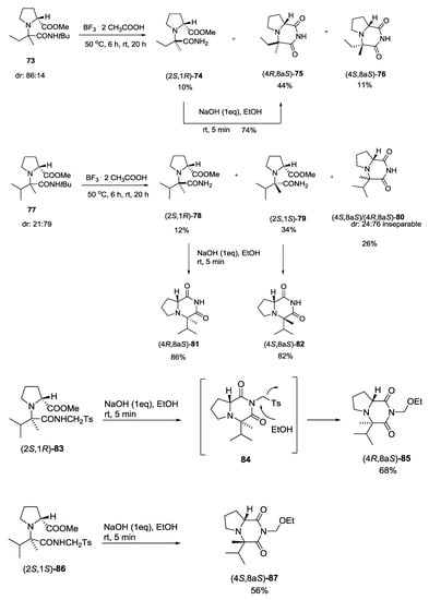 The sense of diastereoinduction, for reactions with unsymmetrical ketones, was studied by Turło et al. by converting the resulting Ugi adducts into the corresponding rigid 2,6-diketopiperazine derivatives (Scheme 18). In particular, in this study, the authors expanded the scope of the Ugi-5C-4CR to secondary α-amino acids, such as proline, and to ketones. The linear adducts then underwent a N-detert-butylation/cyclocondensation sequence leading to N-unsubstituted cyclic derivatives 75, 76, 80–82 by reacting them in BF3⋯2 CH3COOH. Direct cyclization with NaOH of 83 and 86 gave directly cyclic compounds 85 and 87. NOESY spectra of cyclic compounds showed that stereochemistry was not the same for all the synthesized compounds, but depended on the structure of both the isocyanide and the ketone inputs [].