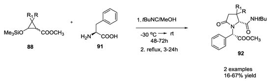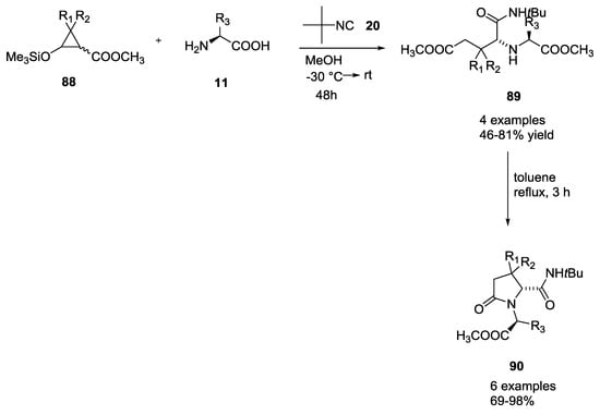 The use of siloxycyclopropanes in the Ugi-5C-4CR was described by Hans-Ulrich Reissig and coworkers to form highly substituted pyrrolidinone derivatives (Scheme 19) []. Siloxycyclopropanes 88 were used as direct precursor of β-formyl esters with tert-butyl isocyanide and α-amino acids yielding the linear coupling products 89 (46–82% yield). These compounds were cyclized to pyrrolidinone derivatives 90 (16–98% yield) by heating them in toluene at reflux temperature.