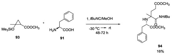 Precursors of γ-ketoesters such as 93 seemed to be inefficient in Ugi reactions, providing only 16% of the desired adduct 94 (Scheme 21).