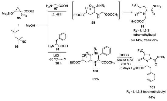 Similarly, 1-trifluoromethyl-2-(trimethylsilyloxy)cyclopropanecarboxylate 95, isonitriles and α-amino acids (such as glycine 97 and phenylalanine 91) provided CF3-substituted γ-lactam (Scheme 22) []. In particular, the reaction with glycine at reflux temperature gave the cyclic compound 99 directly, without isolation of the linear compound 98. On the contrary, when the U-5C-4CR was performed with phenylalanine, the reaction mixture was heating for 5 days to cyclize to γ-lactam 101.