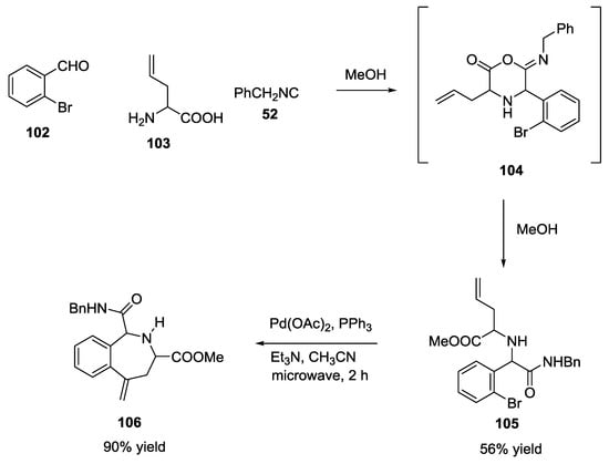 The U-5C-4CR can be extremely powerful in getting access to molecular diversity and complexity when the linear adduct is further manipulated in a post-MCR transformation. A few examples have been reported herein. For example, highly functionalized constrained nitrogen-heterocycles were reported by Gracias et al. as examples of post-Ugi reaction manipulation []. Allyl glycine 103, o-bromo-benzaldehyde 102 and benzyl isocyanide 52 in methanol yielded the Ugi cyclic adduct 104, which was quickly converted into the aminoester 103. Finally, a microwave-assisted Heck cyclization generated N-containing heterocycle (106) (90% yield, Scheme 23).
